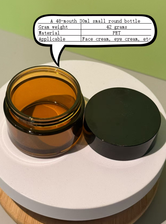 The 48-mouth 30ml small round bottle is suitable for packaging materials of cosmetic bottles and skin care products such as face cream, makeup remover, cream and mud mask. The source factory supports factory inspection and customization.